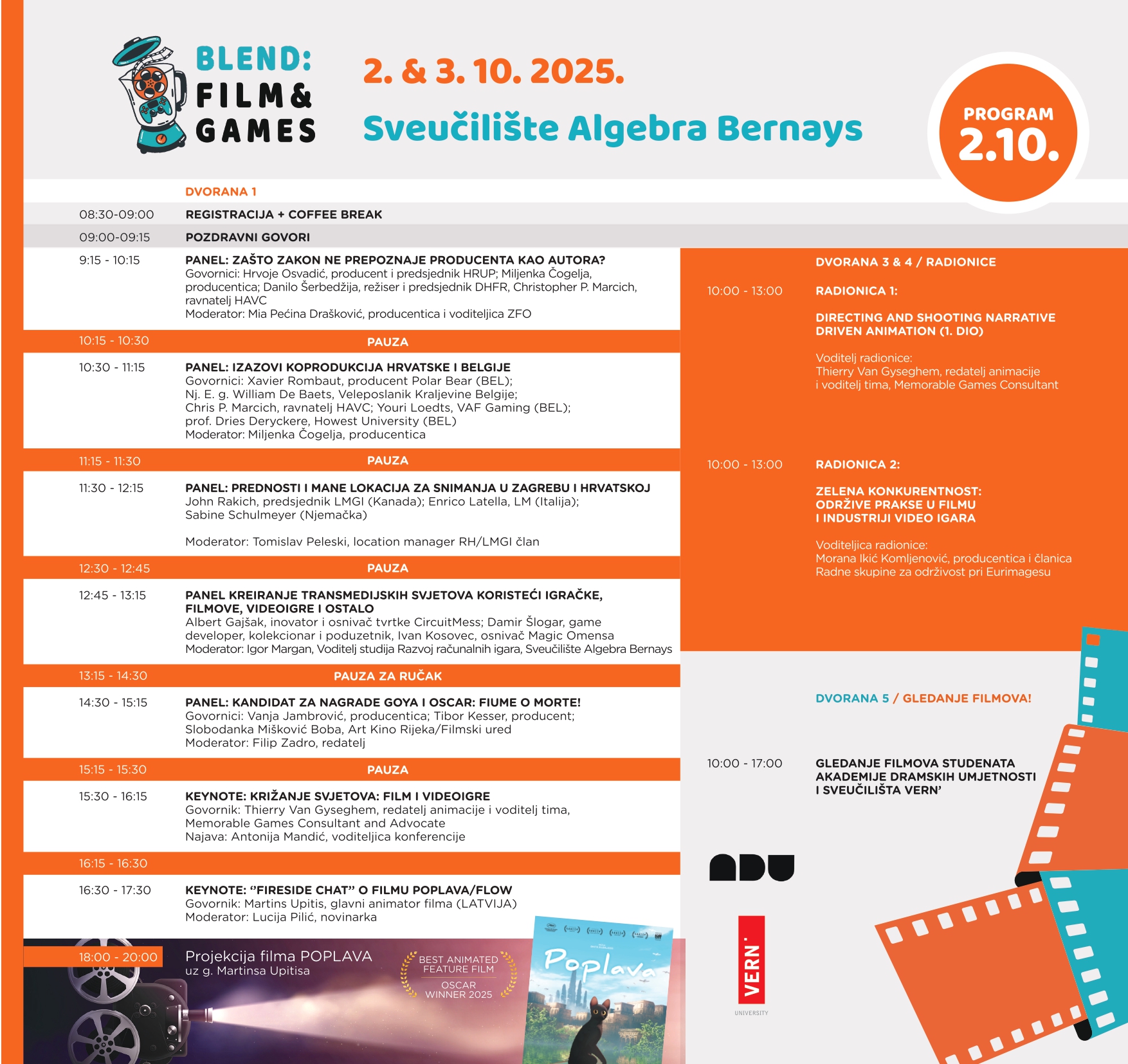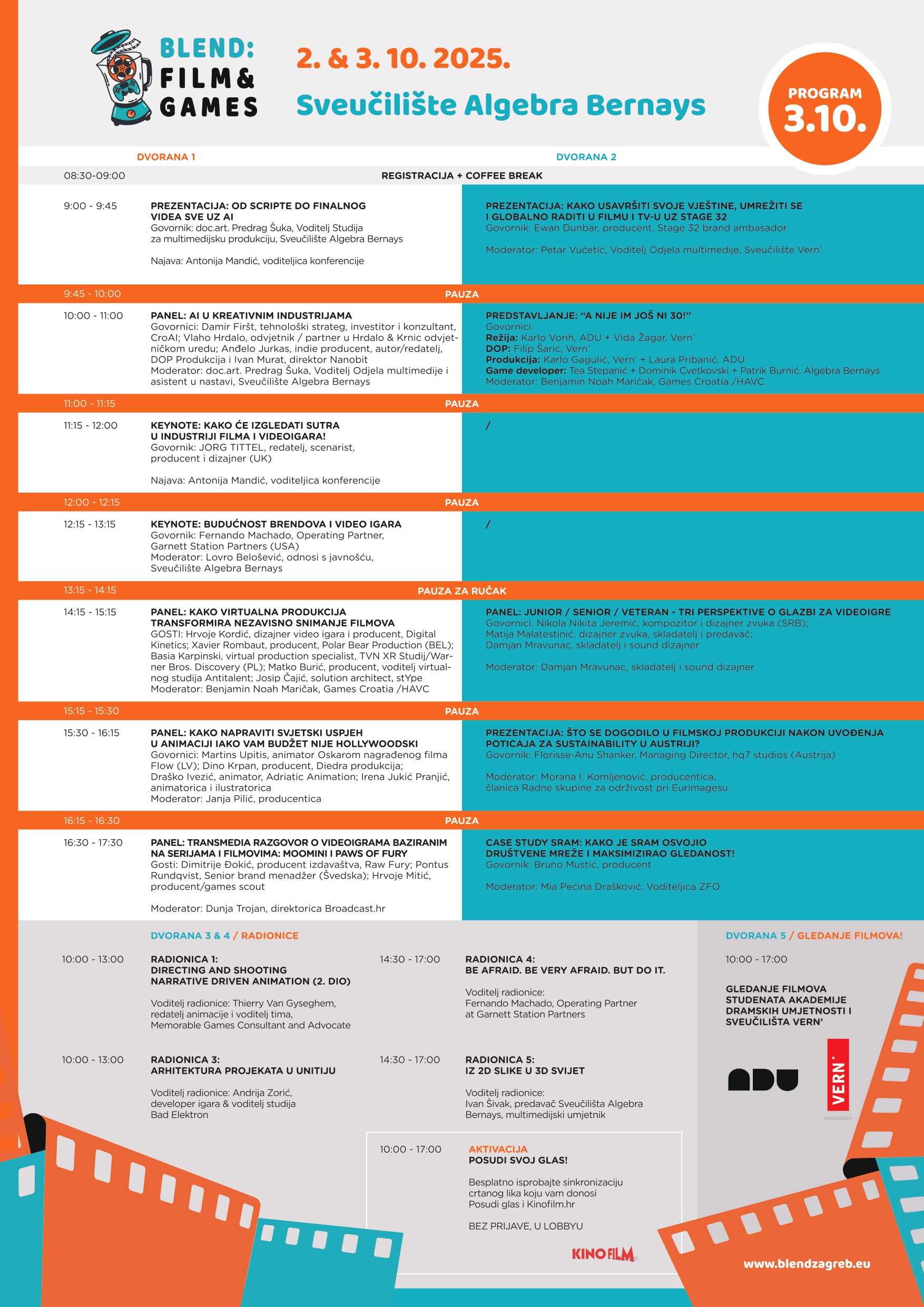 Sudionici će imati priliku čuti o najnovijim trendovima, kreativnim procesima i budućnosti industrije na sjecištu filma, igara i novih tehnologija. Ulaz na konferenciju je besplatan uz registraciju do 1. listopada na www.blendzagreb.eu.